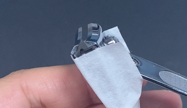 在指甲剪两侧贴上胶布时,前端要稍稍留出一点空隙,方便剪的时候观察。这点空隙不大,刚好能让指甲碎垂直落下。